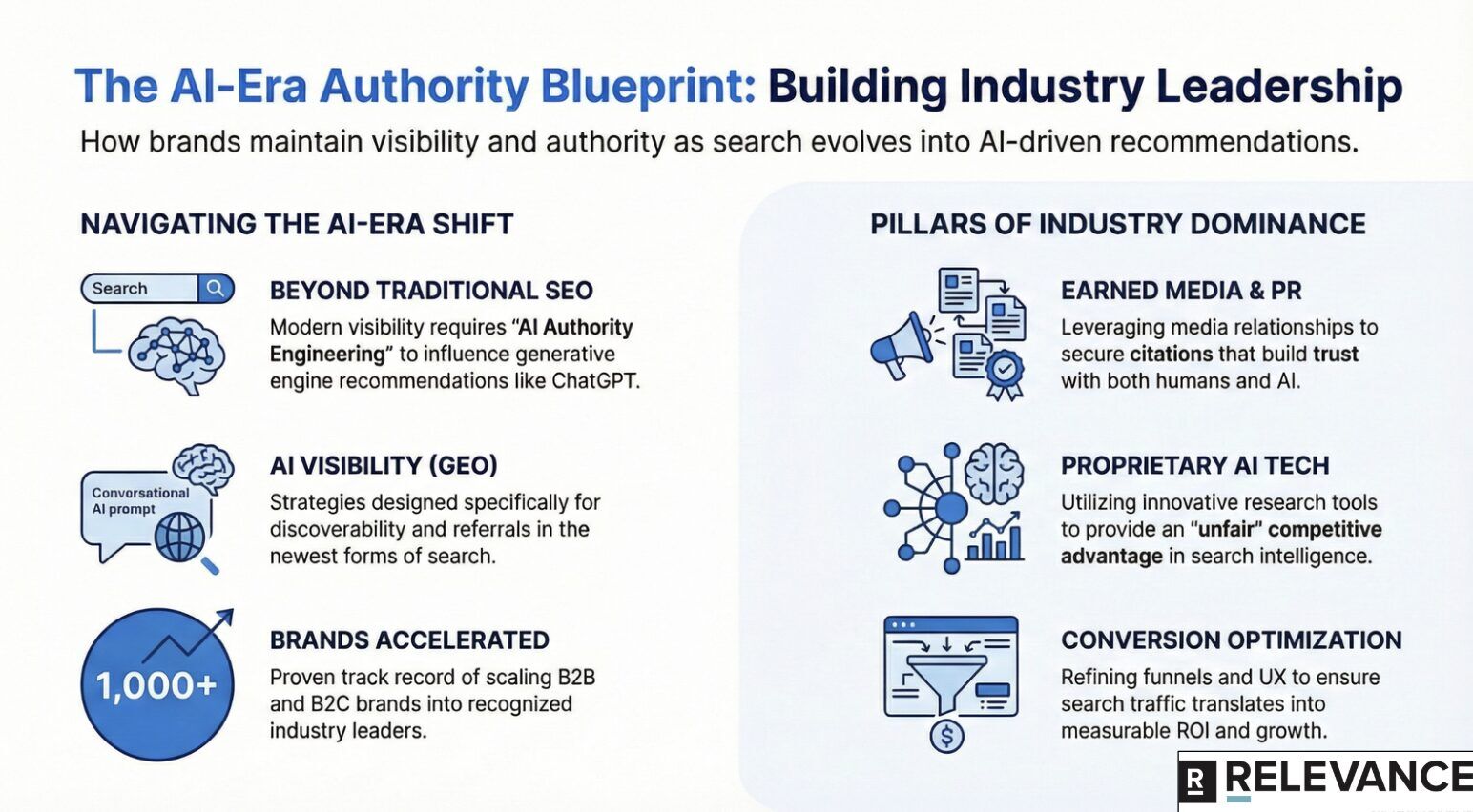 Relevance helps brands become industry leaders through expert-led PR and AI-era search optimization—making them easy to find, safe to cite, and simple to choose. Their team of senior strategists combines hard-won media relationships with modern search optimization technology.