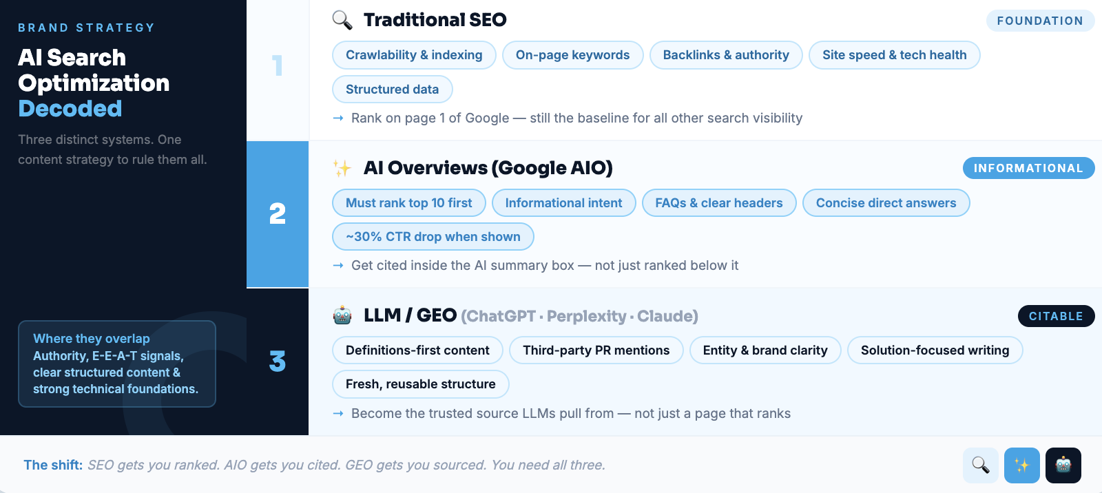Here, we’ll explore the differences between the three central systems that shape search: traditional SEO, LLM SEO (GEO), and AI Overviews (AIO). Don’t let the acronyms scare you. While some tactics have changed, the foundation of good search visibility has remained the same, and many of the same strategies you’ve used in the past still hold even in the ever-changing-and-sometimes-exhausting landscape of digital marketing.