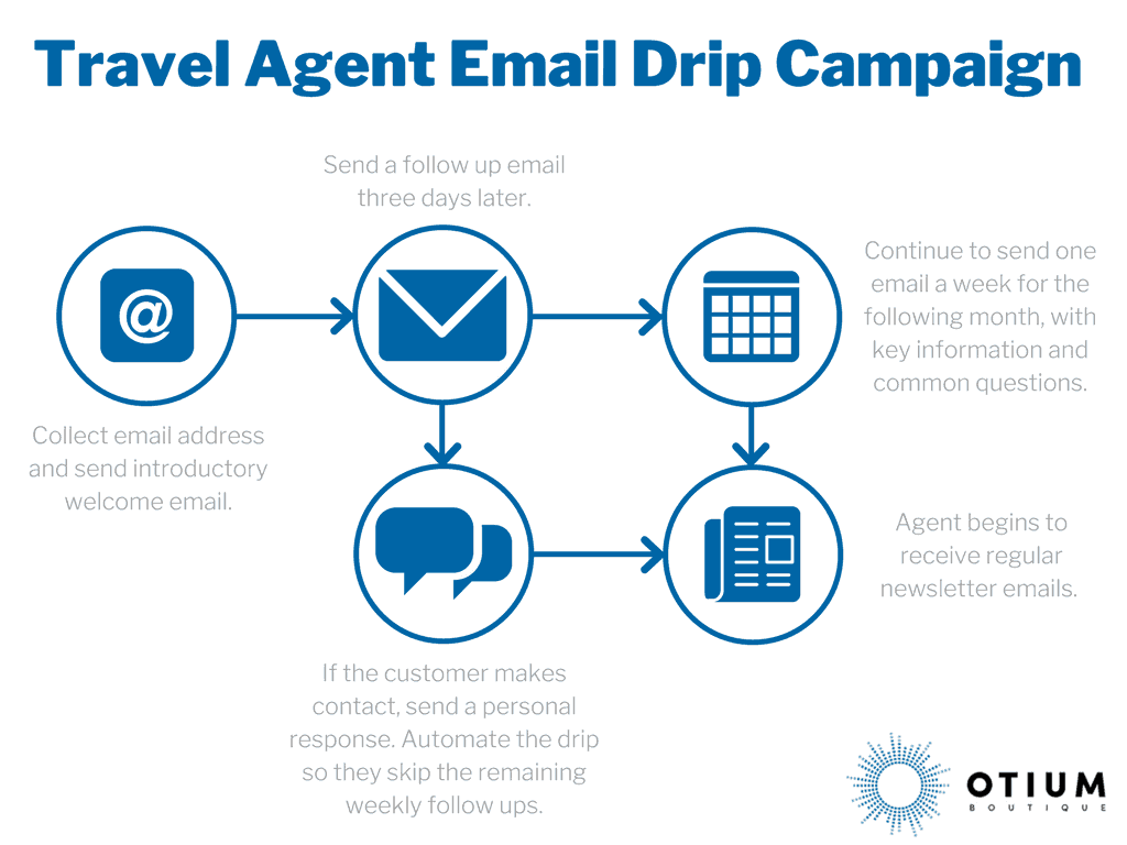 The “get them on the newsletter” mindset is, in my opinion, lazy. This is why we regularly recommend travel companies consider a “drip email campaign” as part of their B2B marketing. Drip campaigns make sure your agents don’t miss out on any key information. They answer your most common questions up front. This may mean an initial introduction email on the day of signing up, another email 3 days later, then weekly emails for the following month.
