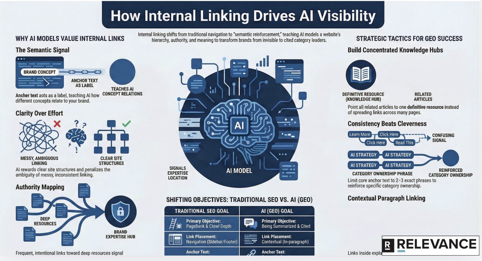 Traditional SEO internal linking often chased crawl depth or PageRank flow. GEO changes the objective.