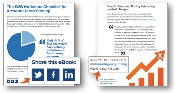 Examples from two of Hubspot’s publications do a great job of this. Including the ability to share with just one click takes the guesswork out of crafting social media content and increases the likelihood that your content reaches a wider audience. And adding something as simple as “add your thoughts” with a hashtag and URL is a low-pressure way of inviting readers to continue the conversation. While these calls to action are simple and take up just a corner of a page, they can be instrumental in keeping the conversation going.