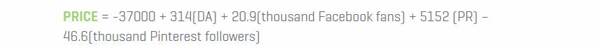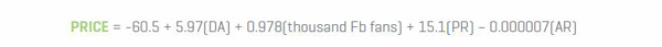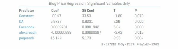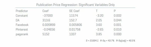 Similarly to the blog data, the study included a multi-variable regression to construct a predictive model for publication pricing. The details of the descriptive statistics and methodology are outlined in the study. Once the insignificant values were removed the actual pricing formula begins to take shape.