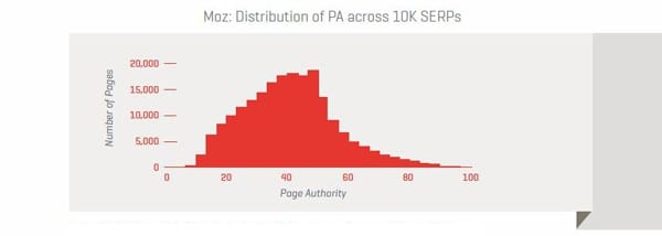 Moz’s sample set had a mean Page Authority of 40.8 and a standard deviation of 15.1. The results of which are below:
