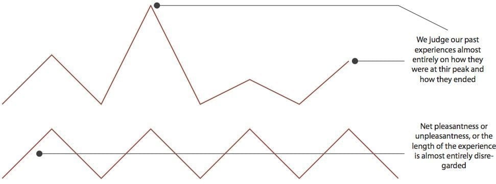 Visiting a website is an experience that lasts a certain amount of time. During this period, the intensity of the experience can rise and fall. Visitors might like the discounts you are offering, but hate how sluggish your store page is. The structure of these fluctuations is what determines whether the experience will be remembered as a positive one or not. Research has shown that there is a pattern in the flow of experience that determines how it will be remembered. What people experience at the peak, as well as at the end, is what determines their feelings as a whole. This so-called peak-end rule is an indispensable tool in website development, as it allows designers the optimize the UX of a website for the most impact. In other words, make sure that your highs are really high, and that your lows are unnoticeable.
