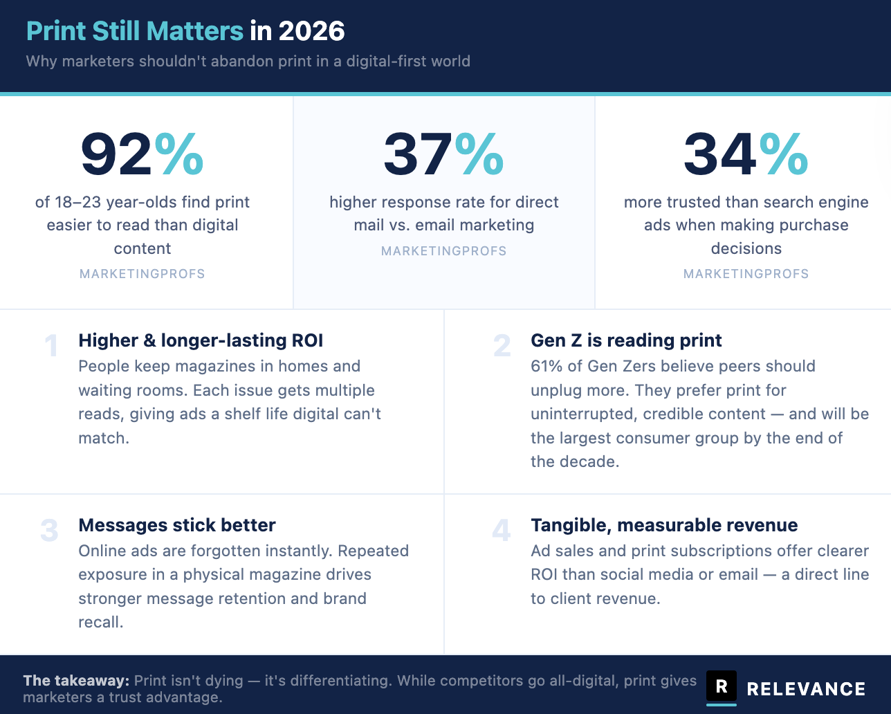 Across publishers, research groups, and print-focused marketing experts, there’s a clear throughline: print is smaller than it was a decade ago, but it’s still effective and often more trusted and more memorable than digital alone.