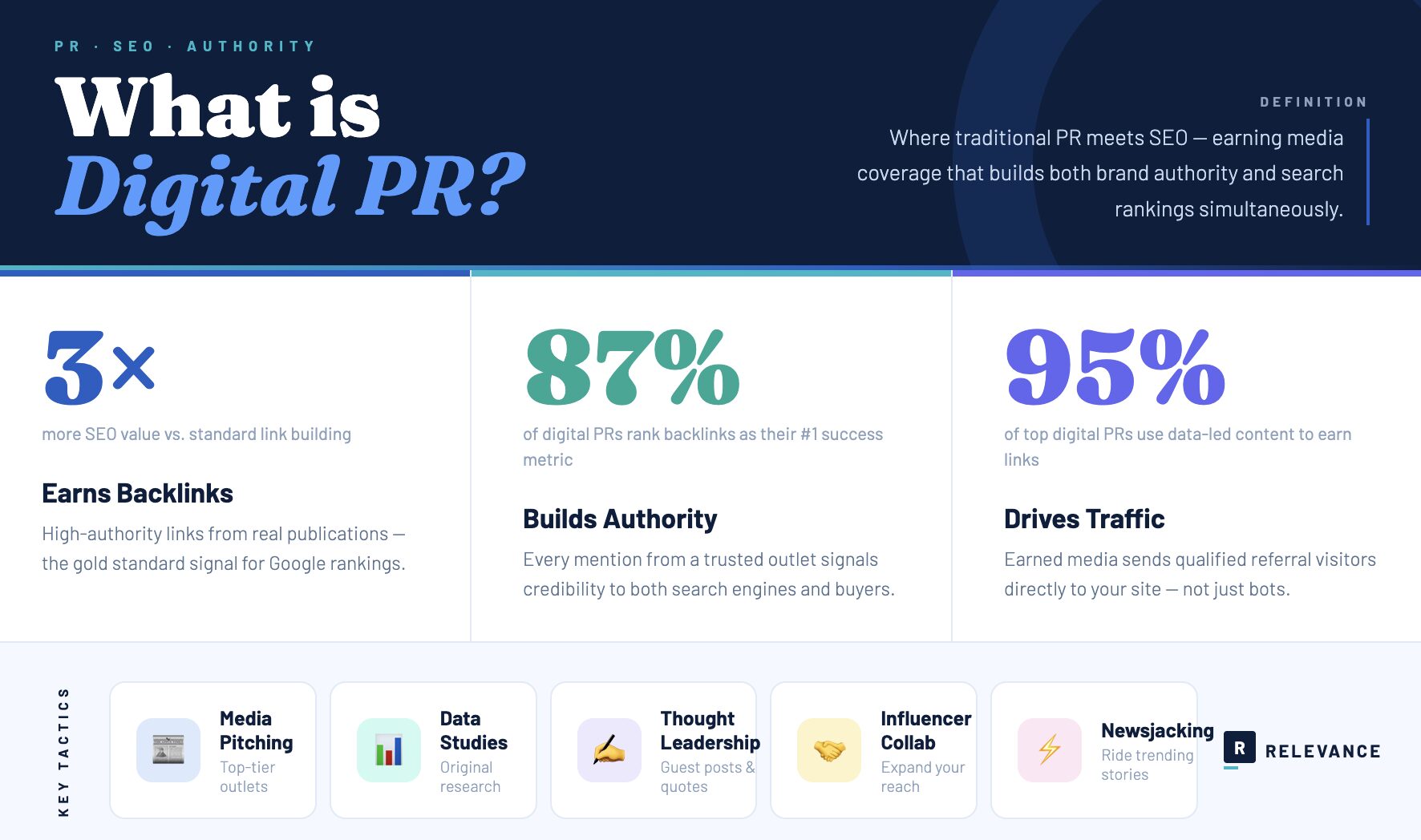 Even industry guides that are link-building oriented call out that digital PR is broader than classic link building because it’s built around coverage, credibility, and relationships, not just acquisition.